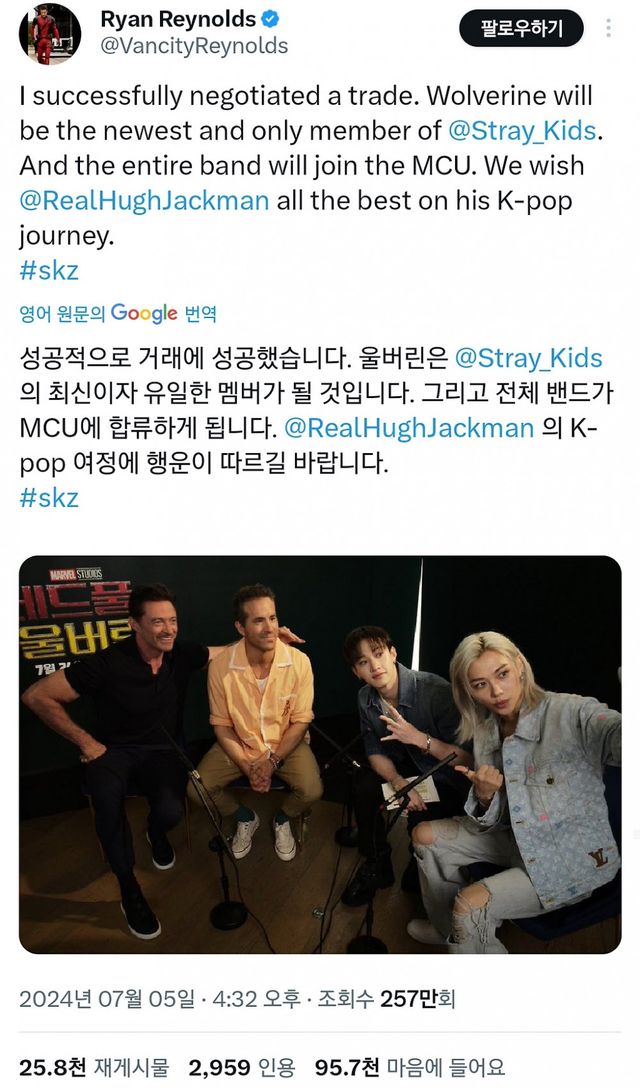 둘이 영화 <데드풀과 울버린> 홍보로 내한함