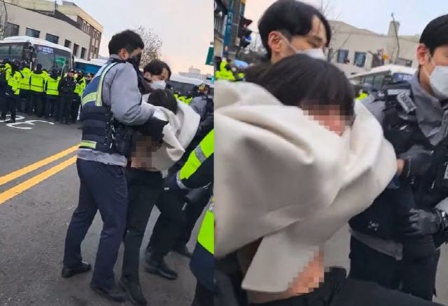 23일 사회관계망서비스(SNS)와 온라인을 중심으로 지난 18일 오후 4시 50분쯤 헌재와 가까운 안국역 2번 출구 인근에서 쇠 지렛대를 소지하고 있던 지지자가 경찰에 붙잡혀 끌려가는 영상이 확산했다.