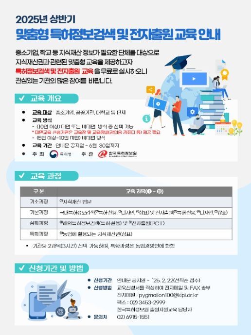 ‘지식재산권 초청 교육’은 개인을 대상으로 진행하는 교육 프로그램으로, 특허, 실용신안, 디자인 정보검색·전자출원 방법은 물론 저작권과 영업비밀보호에 관한 교육도 제공한다.