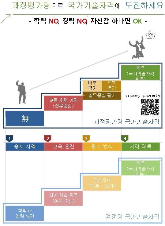 검정형 국가기술자격은 학력 및 경력 등 요건이 부합해야 시험에 응시할 수 있는 데 반해, 과정평가형 국가기술자격은 과정을 이수할 수 있는 역량이 있는 사람이면 누구나 참여할 수 있다는 점이 가장 큰 차이점이다.