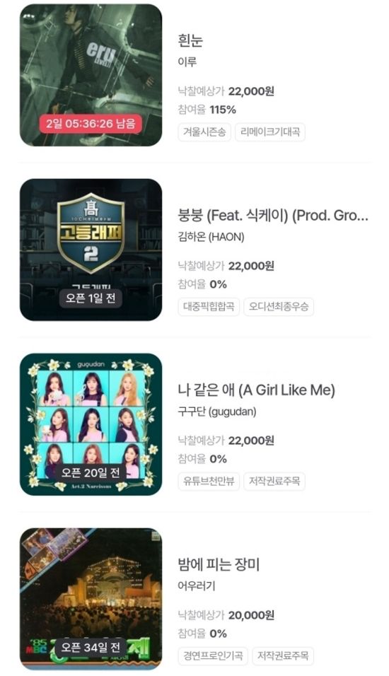 후속 옥션으로는 김하온의 '붕붕'(1월 22일~2월 7일), 구구단의 '나 같은 애'(2월 10일~21일), 어우러기의 '밤에 피는 장미'(2월 24일~3월 10일) 저작재산권 음악증권 옥션이 준비됐다.