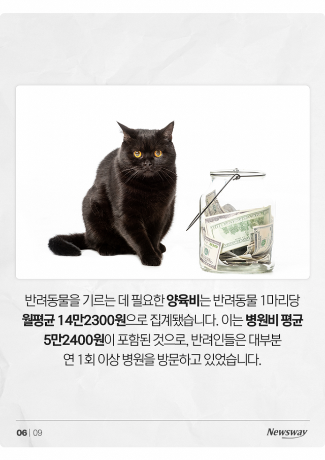 반려동물을 기르는 데 필요한 양육비는 반려동물 1마리당 월평균 14만2300원으로 집계됐습니다. 이는 병원비 평균 5만2400원이 포함된 것으로, 반려인들은 대부분 연 1회 이상 병원을 방문하고 있었습니다.