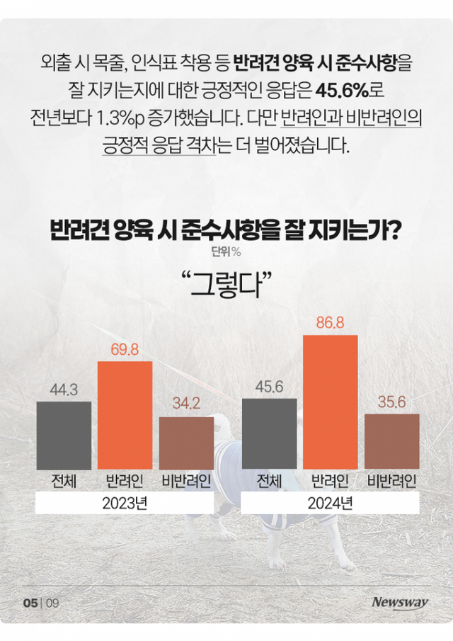 외출 시 목줄, 인식표 착용 등 반려견 양육 시 준수사항을 잘 지키는지에 대한 긍정적인 응답은 45.6%로 전년보다 1.3%p 증가했습니다. 다만 반려인과 비반려인의 긍정적 응답 격차는 더 벌어졌습니다.