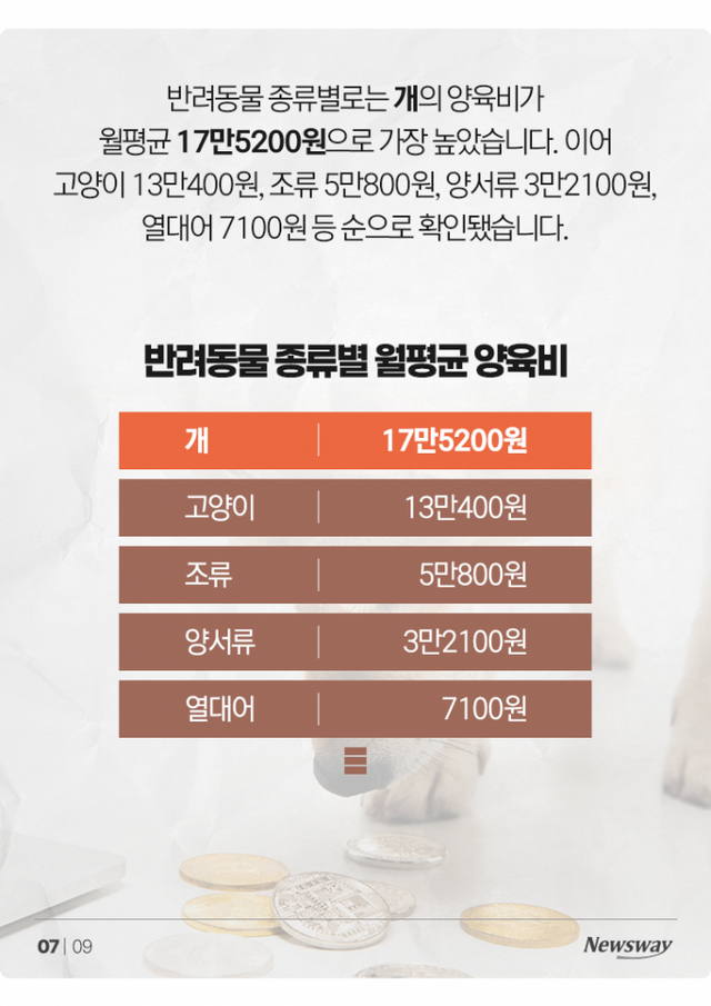 반려동물 종류별로는 개의 양육비가 월평균 17만5200원으로 가장 높았습니다. 이어 고양이 13만400원, 조류 5만800원, 양서류 3만2100원, 열대어 7100원 등 순으로 확인됐습니다.