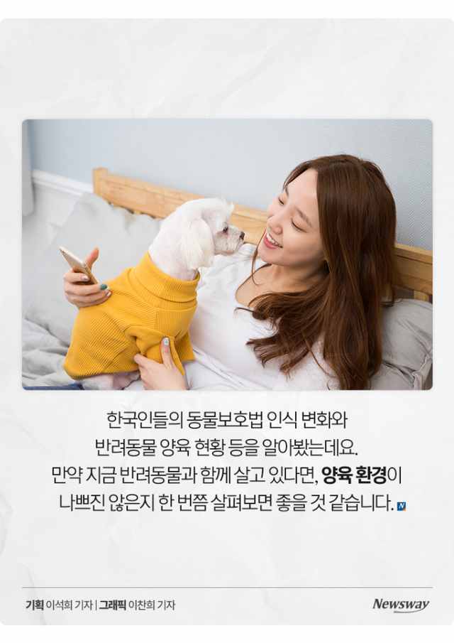 한국인들의 동물보호법 인식 변화와 반려동물 양육 현황 등을 알아봤는데요. 만약 지금 반려동물과 함께 살고 있다면, 양육 환경이 나쁘진 않은지 한 번쯤 살펴보면 좋을 것 같습니다.