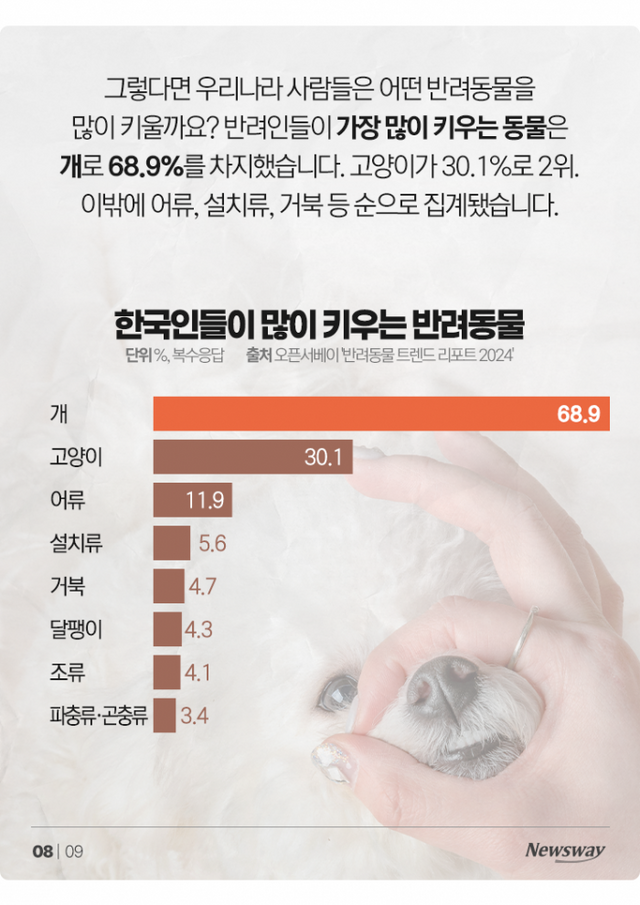 그렇다면 우리나라 사람들은 어떤 반려동물을 많이 키울까요? 반려인들이 가장 많이 키우는 동물은 개로 68.9%를 차지했습니다. 고양이가 30.1%로 2위. 이밖에 어류, 설치류, 거북 등 순으로 집계됐습니다.