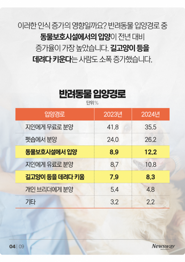 이러한 인식 증가의 영향일까요? 반려동물 입양경로 중 동물보호시설에서의 입양이 전년 대비 증가율이 가장 높았습니다. 길고양이 등을 데려다 키운다는 사람도 소폭 증가했습니다.