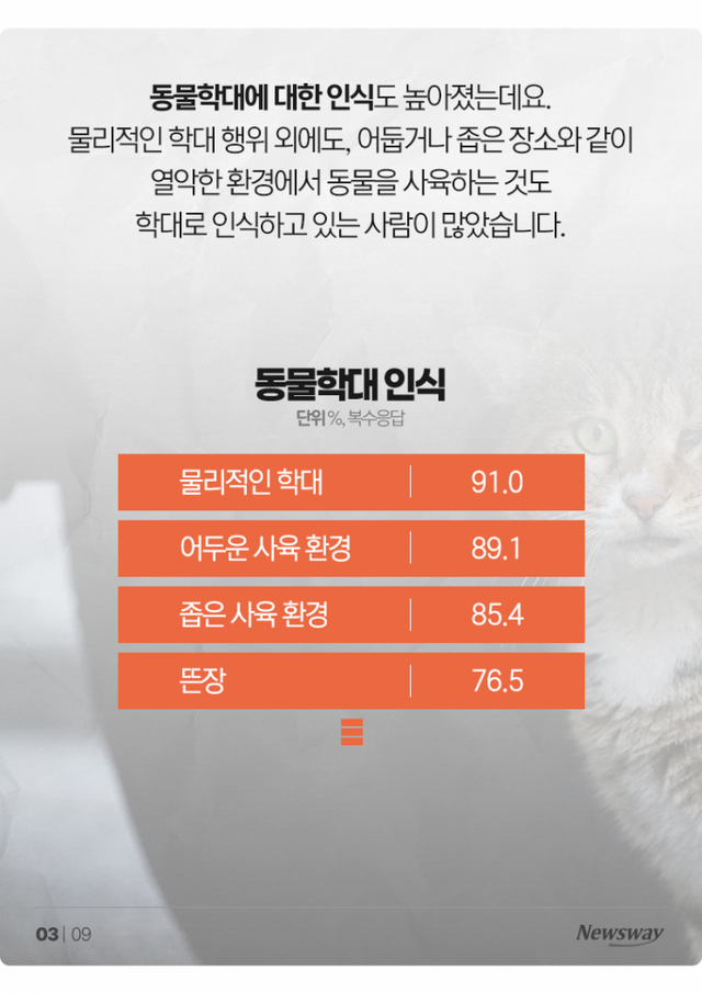 동물학대에 대한 인식도 높아졌는데요. 물리적인 학대 행위 외에도, 어둡거나 좁은 장소와 같이 열악한 환경에서 동물을 사육하는 것도 학대로 인식하고 있는 사람이 많았습니다.