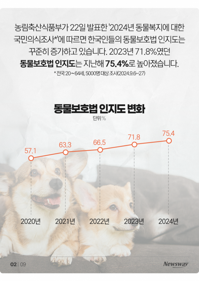 농림축산식품부가 22일 발표한 '2024년 동물복지에 대한 국민의식조사'에 따르면 한국인들의 동물보호법 인지도는 꾸준히 증가하고 있습니다. 2023년 71.8%였던 동물보호법 인지도는 지난해 75.4%로 높아졌습니다.