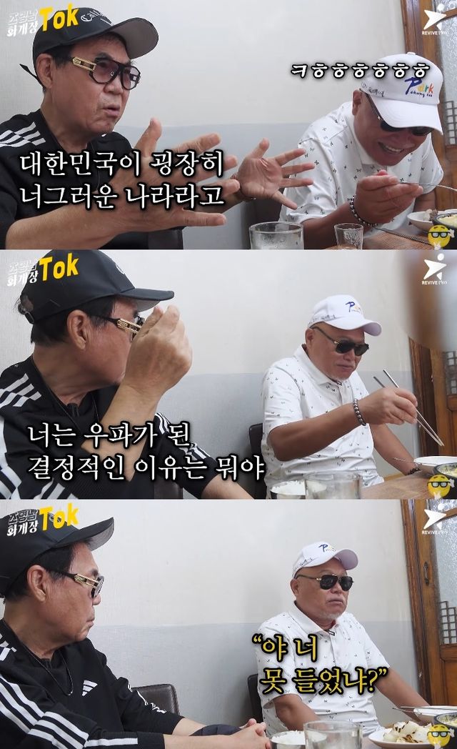 대표적인 우파 연예인 김흥국에게 조영남은 "너는 우파가 된 결정적 계기가 뭐냐"고 묻기도. 이에 김흥국은 "정몽준 회장님이죠 뭐"라며 "처음 얘기하지만 이회창 총재 그분한테 처음으로 홍보위원장이라는 걸 하나 받아봤다"고 답했다.