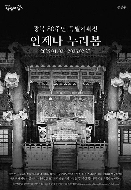 KT&G 상상마당의 올해 첫 번째 전시는 <언제나 누리봄>이다. 1월 2일 KT&G 대치 갤러리에서 시작됐다. <언제나 누리봄>은 광복 80주년 특별기획전이다. 누리봄은 ‘우리 모두가 세상(누리)을 희망차게 가꾸는 사람이 되자’라는 뜻의 순우리말이라고. 태어나서 처음 들어봤지만, 왠지 새해에 어울리는 훈훈한 덕담 같은 단어다. 전시는 제목의 ‘누리봄’처럼 일제강점기에 많이 훼손됐지만 여전히 아름다운 창덕궁을 흑백사진으로 새롭게 담았다. 창덕궁을 다시 보며 꾸준히 가꿔나가자는 의도다. 여전히 꿋꿋하게 존재하는 창덕궁이 광복 80주년의 의미도 되새긴다. 전시에선 김성수 사진가가 촬영한 인정전, 낙선재 등 창덕궁의 전각과 후원을 사뭇 다른 시선으로 볼 수 있다. 전시는 2월 27일까지.