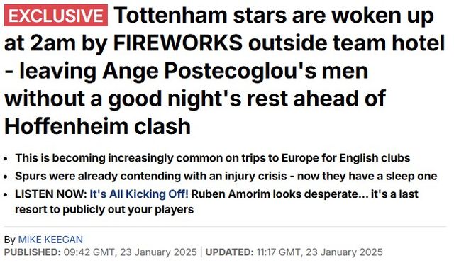 영국 매체 '데일리 메일'은 23일 "토트넘 선수단이 호펜하임과 유로파리그 경기를 앞두고 새벽 2시 호텔 밖 불꽃놀이 때문에 방해를 받았다"라고 보도했다.