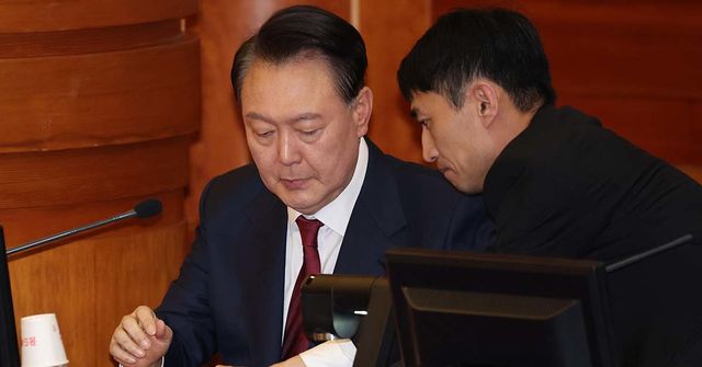 윤석열 대통령이 23일 오후 서울 종로구 헌법재판소 대심판정에서 열린 탄핵심판 4차 변론기일에 출석해 메모지를 건네받고 있다. / 뉴스1