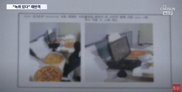 두번째 사진에서 모니터 클로즈업 한걸보면 사무실내 cctv 모니터이고 모니터상에서 피자 먹는게 보인다 주장하는듯