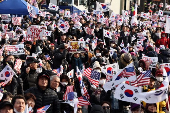 이에 대항하기 위한 보수집회에서는 또다시 ‘태극기’가 성조기와 함께 나풀거렸다. 일명 ‘태극기 부대’로 불리는 집회는 대표적인 보수집회다. 윤 대통령 탄핵을 계기로 다시금 주목을 받았다. 태극기 집회는 박근혜 전 대통령 탄핵 때 등장해 이목이 쏠렸다. 당시 집회 참가자들이 태극기와 성조기를 집회 도구로 사용했다.