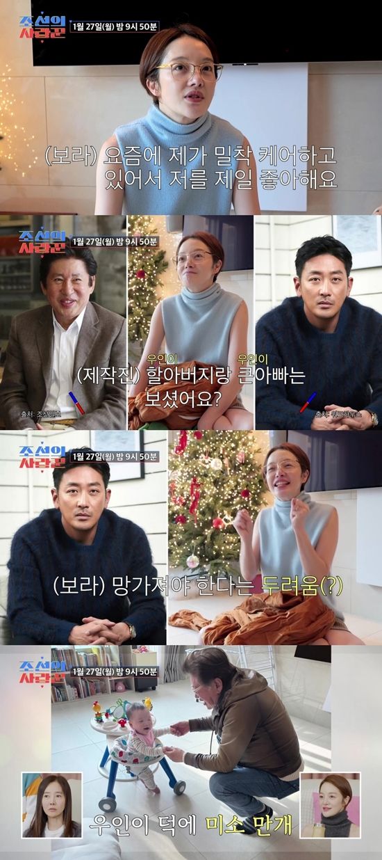 또, 일주일에 한 번씩은 우인이를 보러 온다는 할아버지 김용건과 큰아빠 하정우의 비밀스런(?) 육아 방법도 공개했다. 황보라는 "큰아빠는 망가져야 한다는 두려움이 있는 것 같다"며 "제가 안고 있다가 우인이가 웃는 것 같아 쳐다보면, 망가지는 표정을 지으면서 놀아주다가 멈춘다. 창피해 하는 것 같다"고 장난기 넘치는 하정우의 색다른 면모를 폭로했다.