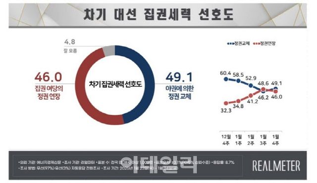 리얼미터가 에너지경제신문 의뢰로 지난 23~24일 전국 만 18세 이상 유권자 1002명을 대상으로 실시한 1월 4주 차 여론조사에 따르면 ‘야권에 의한 정권 교체’는 49.1%, ‘집권 여당의 정권 연장’은 46.0%로 조사됐다.