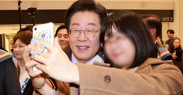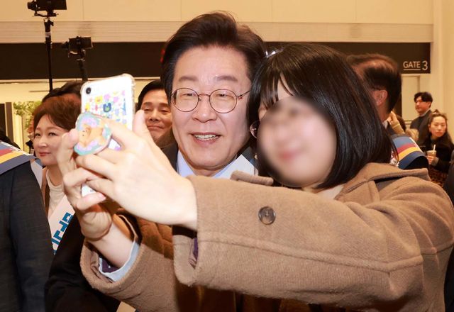 이재명 더불어민주당 대표가 설 연휴를 앞둔 24일 오전 서울 서초구 반포동 고속버스터미널에서 설 귀성객에게 인사하던 중 셀카를 찍고 있다. / 뉴스1 (공동취재)