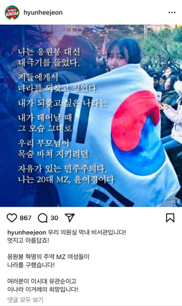 태극기란 상징성을 빼앗기지 않기 위한 민주당 홍보전략은 여기에서 그치지 않습니다. 민주당 의원들은 자신의 사회관계망서비스(SNS)를 통해서 홍보에 나서고 있습니다. 최고위원인 전현희 의원은 본인의 SNS를 통해 태극기를 감싼 비서관 모습을 게재하며 홍보에 나서기도 했습니다. 전 의원은 해당 사진과 함께 “나는 응원봉 대신 태극기를 들었다. 저들에게서 나라를 되찾고 싶었다. 내가 되찾고 싶은 나라는 내가 태어날 때 그 모습 그대로 우리 부모님이 목숨 바쳐 지키려던 자유가 있는 민주주의다”라고 올렸습니다.