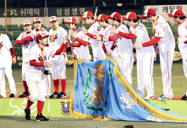 2010.10.19 대구=정시종기자capa@joongang.co.kr 프로야구 한국시리즈 4차전 삼성-SK 경기가 19일 대구서 열렸다. SK 박정권이 한국시리즈 MVP 를 수상한후 동료들괴 하이파이브하고있다.
