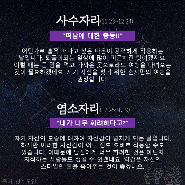 어딘가로 훌쩍 떠나고 싶은 마음이 강력하게 작용하는 날입니다. 되풀이되는 일상에 많이 피곤해진 탓이겠지요. 이럴 때는 큰 맘을 먹고 가까운 곳으로라도 여행을 다녀오는 것이 필요하겠네요. 자기 자신을 찾기 위한 혼자만의 여행을 권장합니다.