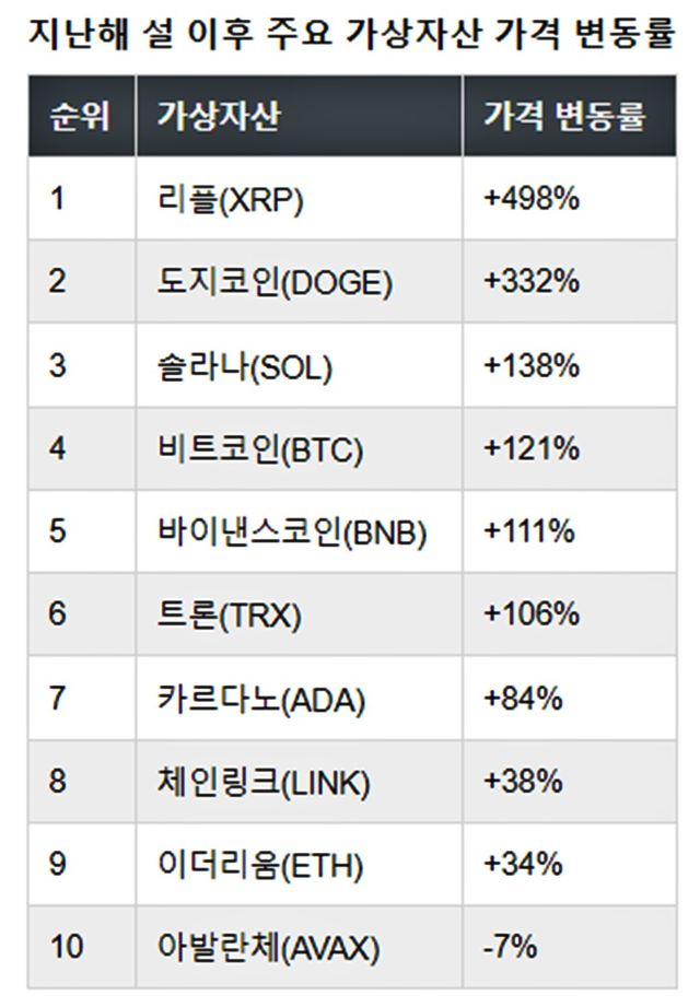 지난해 설 이후 주요 가상자산 가격 변동률 표(편집 위키트리) / 코인마켓캡, 뉴스1