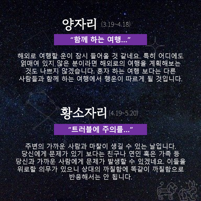 주변의 가까운 사람과 마찰이 생길 수 있는 날입니다. 당신에게 문제가 있기 보다는 친구나 연인 혹은 가족 등 당신과 가까운 사람에게 문제가 발생할 수 있겠네요. 이들을 위로할 의무가 있으니 상대의 까칠함에 똑같이 까칠함으로 반응해서는 안 됩니다.