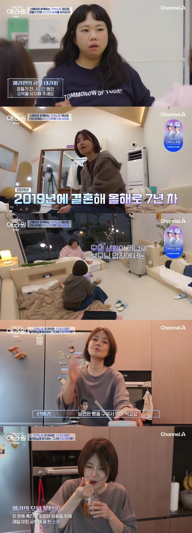 28일 방송된 채널A '테라피 하우스 애라원'에는 신애라를 필두로 이현이, 홍현희, 신기루가 크루로 합류했다. 네 사람은 '저속 노화'를 위해 식단, 운동 등을 탐구했다.
