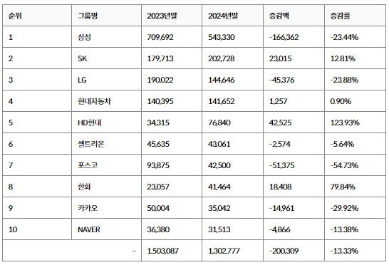 이어 셀트리온그룹(43조610억원), 포스코그룹(42조5000억원), 한화그룹(41조4640억원), 카카오그룹(35조420억원), 네이버그룹(31조5130억원)이 10위권에 포함됐다.