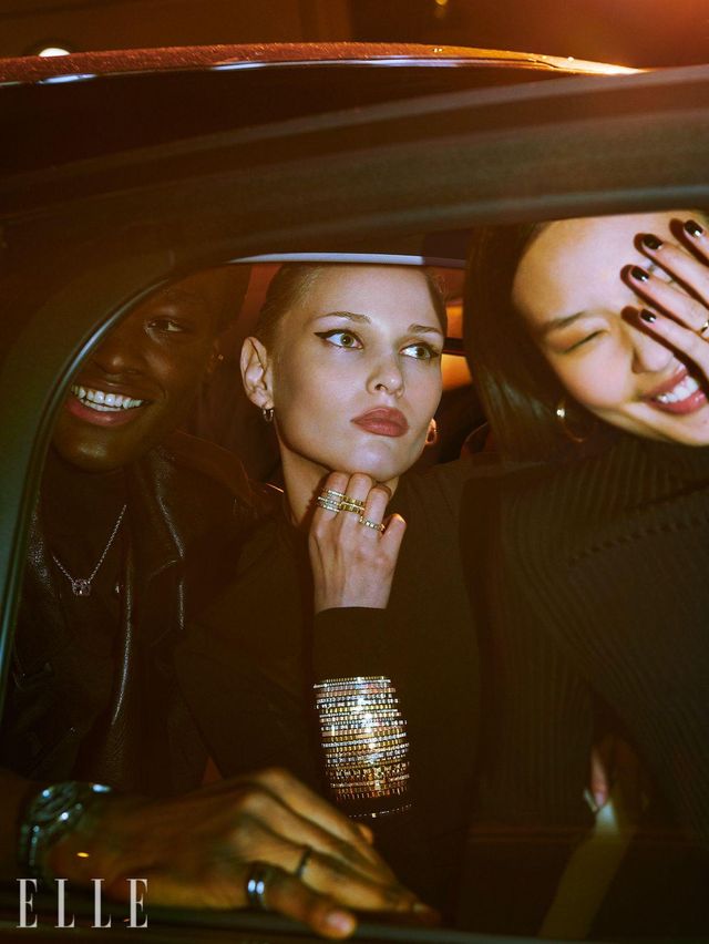 3 잔이 착용한 에시컬 18K 화이트 골드에 다이아몬드를 세팅한 아이스 큐브 네크리스와 링, 브레이슬릿, 이어링, 에시컬 18K 로즈 골드 아이스 큐브 이어 커프는 모두 Chopard. 코튼 재킷과 톱은 모두 Philosophy by Lorenzo Serafini. 아리나가 착용한 다이아몬드를 세팅한 에시컬 18K 화이트, 옐로, 로즈 골드 아이스 큐브 펜던트와 브레이슬릿, 이어링, 링은 모두 Chopard. 레더 봄버 재킷은 Karl Lagerfeld. 팬츠는 Philosophy by Lorenzo Serafini