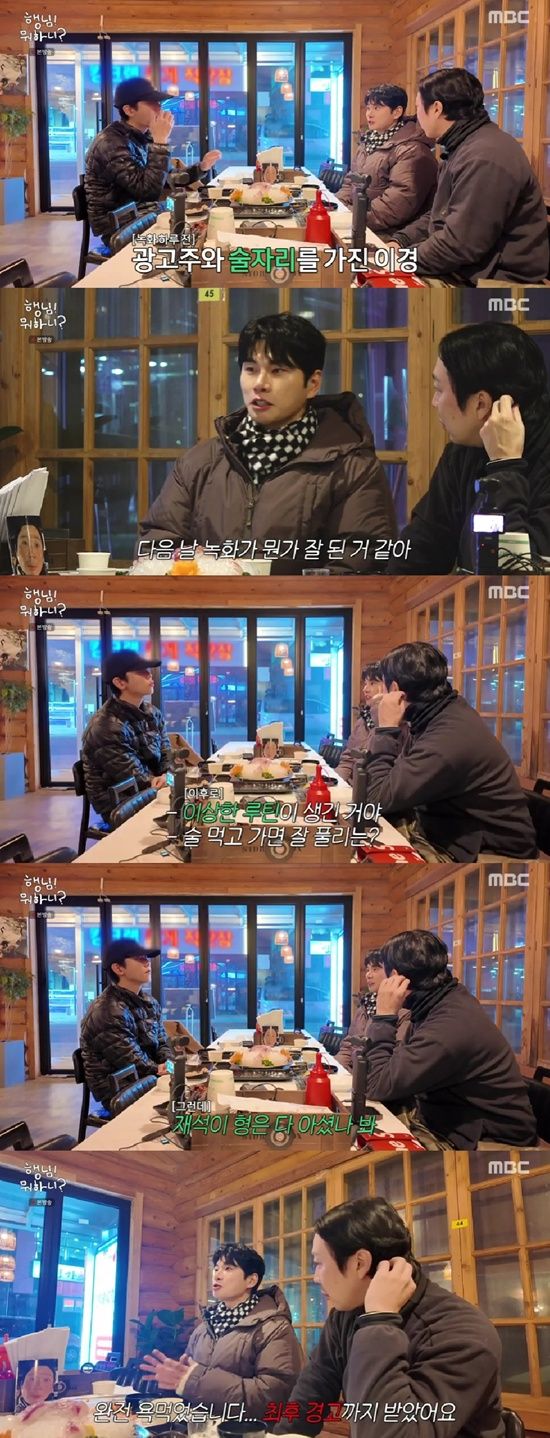 이이경은 "재석이 형은 나한테 진짜 나를 사람 만들어주고 계신다. 내가 한번 광고주 분들이랑 술자리를 한 적이 있었다. 다음 날 갔는데 녹화가 뭔가 잘 된 거 같았다"며 이후로 전날 술을 한잔 먹고 가는 이상한 루틴이 생겼다고 고백했다.