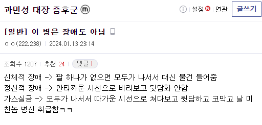 똥 방귀 관련 질환이라 기피 당하거나 비웃음 당할때도 많고 수치스러워서 어디 토로하기도 어려움