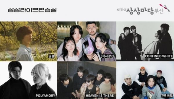 KT&G 상상마당 부산이 신진 뮤지션 발굴 프로그램 '2025 상상라이브연습실'의 TOP 6을 발표했다. 올해 선정된 팀은 권결, 직사광선, 컨파인드화이트, 폴리아모리, 헤븐이즈데어, 7번 국도다.