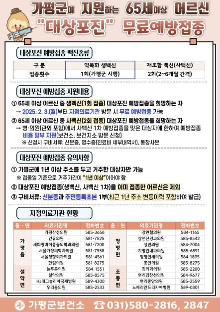 가평군은 2024년에 관련 조례를 제정하고, 같은 해 10월 처음으로 접종을 시행했다. 올해부터는 연중 접종 체계를 마련해 어르신들의 건강을 적극 지원한다.