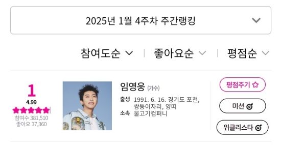 최근 아이돌차트에 따르면, 1월 4주 차(1월 24일~1월 30일) 평점랭킹에서 임영웅은 38만 1,510표를 얻어 최다득표를 기록했다.
