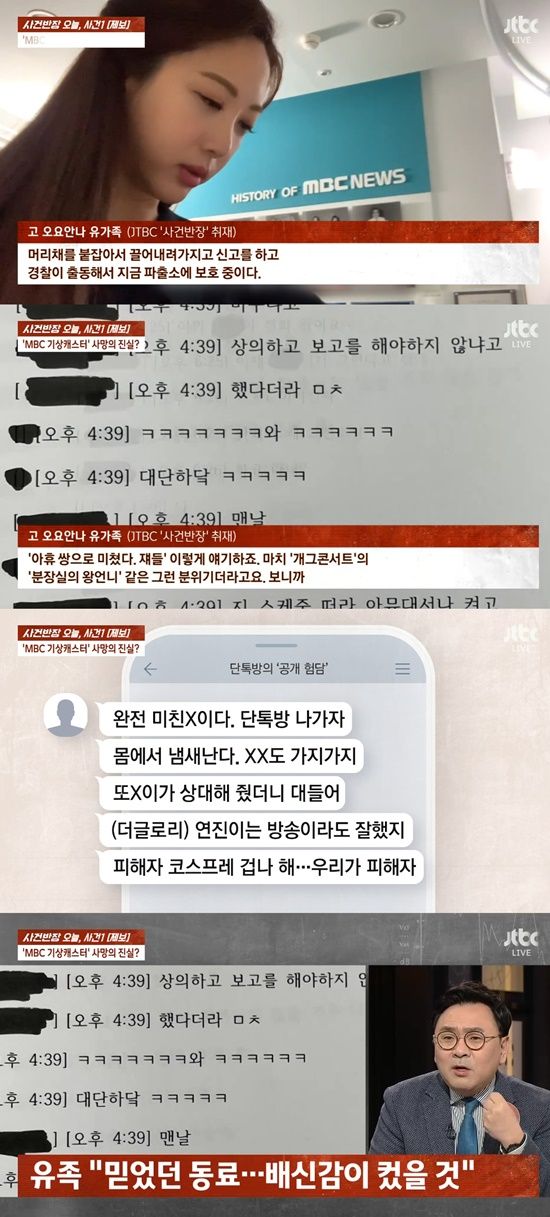 이와 함께 고인을 비난하는 내용이 담긴 직장동료들의 메시지들이 공개됐다. 유가족은 "자기들끼리 만든 단톡방이 있다"며 "아침방송 와서 술 냄새나고 씼지도 않고 와서 이러면서 까더라"라고 억울함을 호소했다.