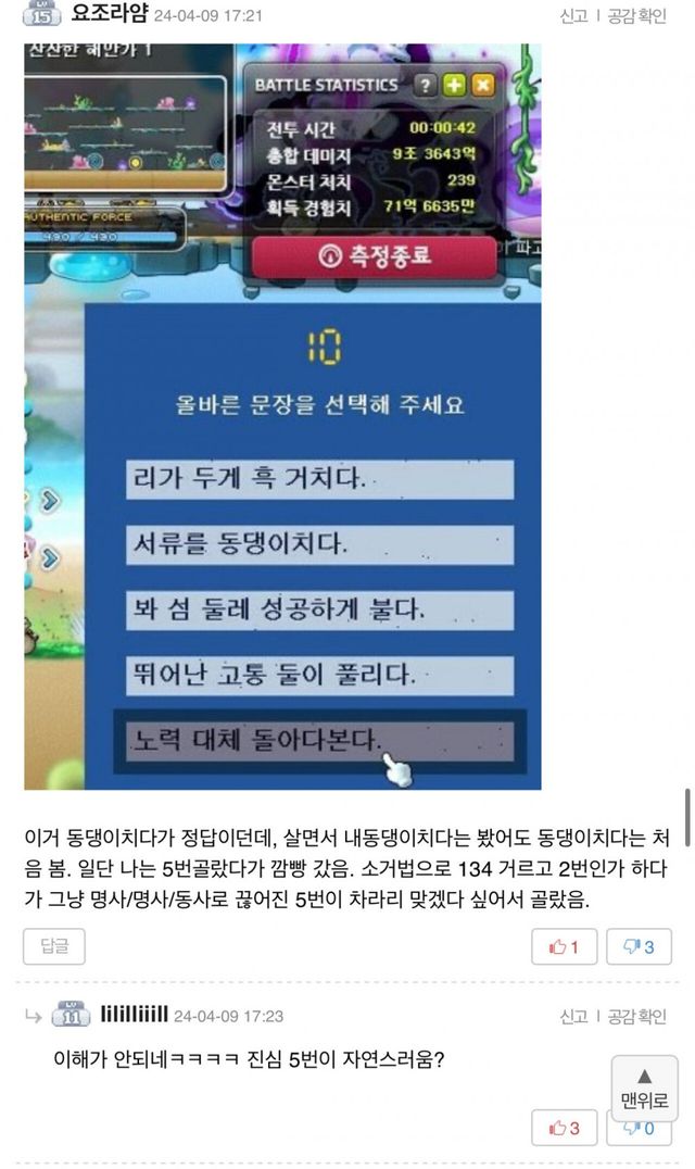 메이플에는 매크로방지(동남아부주 등)를 위한 기능이 있는데 5가지 문장 중 옳은 문장을 선택해야함. 틀리면 진실의 방으로 가서 사냥도 못하고 시간만날림( + 계속틀리면 시간 늘어남)