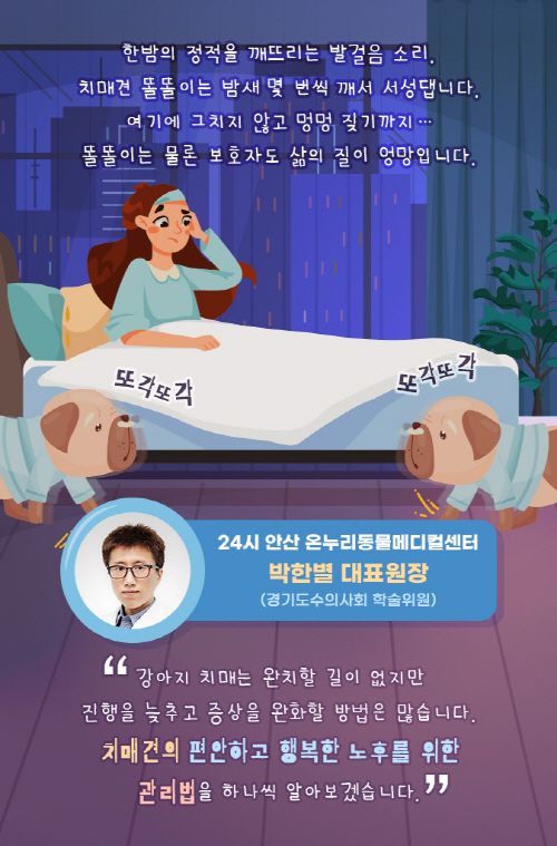 치매견 똘똘이는 밤새 몇 번씩 깨서 서성댑니다.