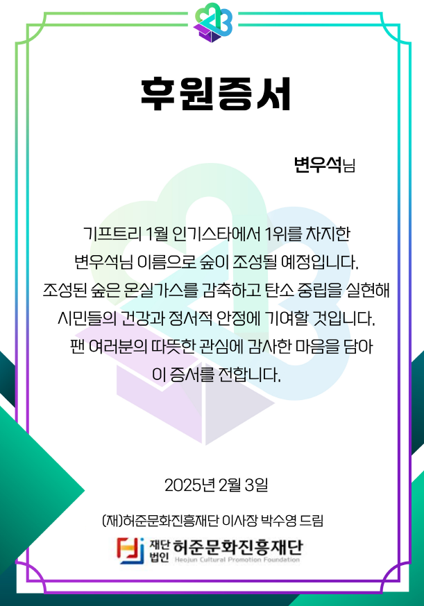 이번 투표에서 1위를 차지한 변우석은 다양한 혜택을 제공받는다. 우선 유동인구가 많아 주목도가 높은 홍대입구역 전광판 광고가 2025년 2월 중으로 일주일 동안 제공된다. 또한 2월 중 나무가 기부되어 2025년 봄에 변우석의 이름을 딴 숲이 조성된다.