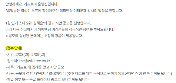 기프트리는 2월 9까지 전광판에 노출될 광고 영상을 공모하고 있다. 김혜윤을 응원하는 팬이라면 누구나 영상 제작에 참여할 수 있으며, 당선된 팬에게는 소정의 경품이 제공된다. 해당 영상은 재편집 없이 전광판에 그대로 노출될 예정이다.