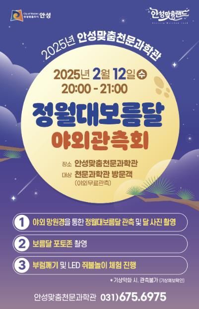 안성맞춤천문과학관은 오는 2월 12월 천문과학관을 방문한 관람객에게 무료티켓을 배부하고, 관람객은 야외에 설치된 이동식 망원경을 통하여 정월대보름달을 육안으로 관측 및 스마트폰 달 사진을 찍은 후, 보름달 포토존 사진을 찍고 오면 안내데스크에서 부럼깨기와 LED 쥐불놀이 체험키트를 증정할 계획으로 안전을 위하여 부모님과 함께 방문하시길 당부했다.