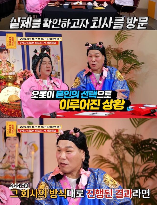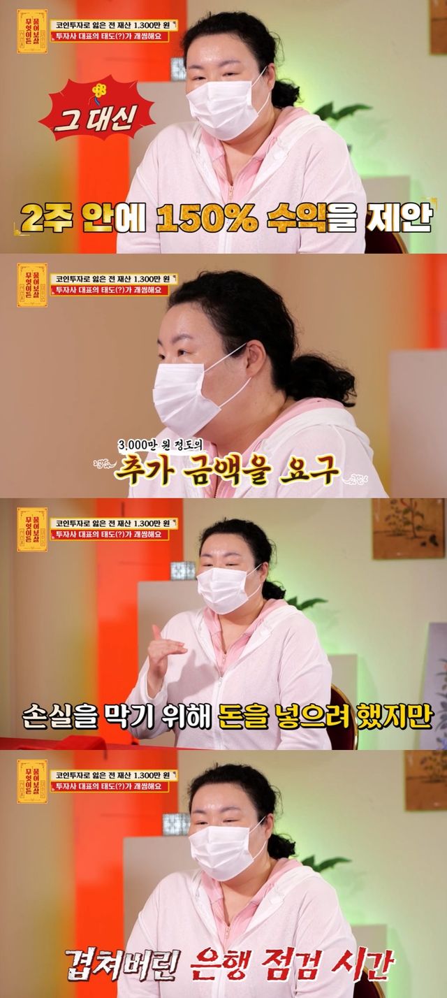 이날 사연자는 "처음엔 80만 원으로 넣었다. 미국 대선 시기라 트럼프가 되면 가격이 오를 거라고 해 투자하겠다고 300만 원을 넣었다. 약속대로 30% 수익이 났다. 제 담당하는 사람이 팀장을 소개하더라"라고 운을 뗐다.