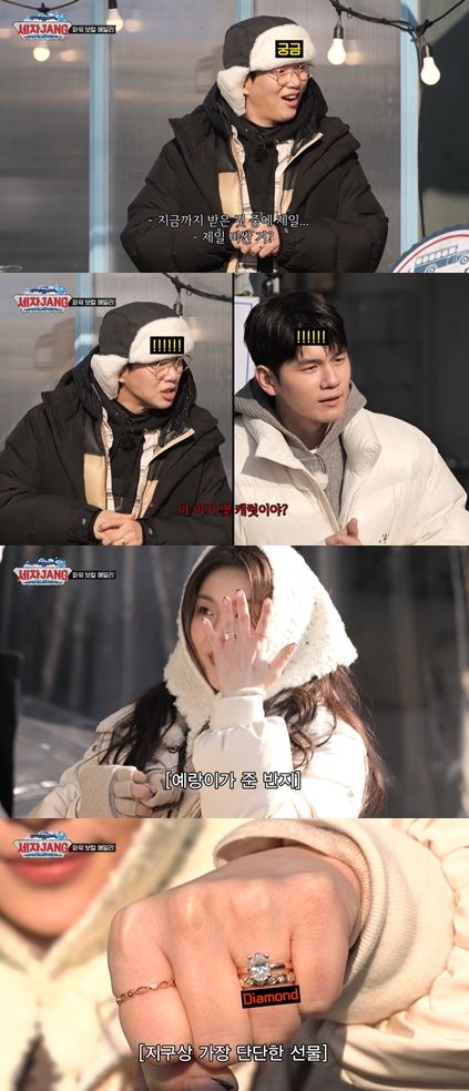 장성규는 "야 이거 몇 캐럿이냐"라면서 다이아 큼지막한 크기에 놀랬고, 장민호는 "최소 5캐럿은 되겠다"라고 혀를 내둘렀다.