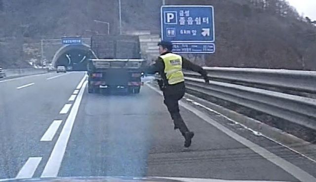 홍 경위는 즉시 순찰차에서 내려 움직이는 화물차를 향해 뛰었고, 맨몸으로 차량 조수석 문을 열고 올라타 차량을 멈춰 세웠다.