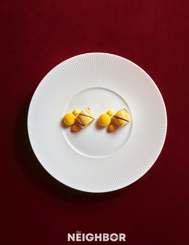 라망시크레의 겨울 시즌 콜드 애피타이저는 제철 대게와 천혜향을 활용한 ‘대게 크레이프’다. 게살과 대게 내장, 수분을 뺀 부라타 치즈, 호박고지, 볶은 건새우 등을 혼합해 크레이프 반죽으로 감쌌는데, 이때 부라타 치즈는 다양한 재료의 맛과 풍미를 잇는 역할을 한다. 크레이프 겉에는 대게 껍질 오일을 발라 윤기와 향을 더했다. 여기에 천혜향 바바루아와 천혜향 퓌레, 사프란 아이올리 소스를 동글동글한 귤 모양으로 곁들였다. 상큼함과 짭조름함, 단맛이 조화롭게 어우러지며 미각을 깨운다.