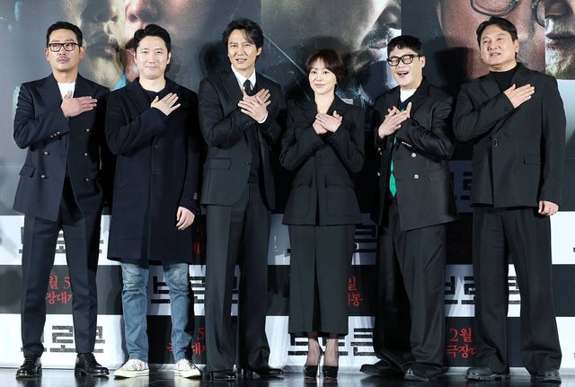 배우 하정우(왼쪽부터)와 김진황 감독, 김남길, 유다인, 임성재, 정만식이 지난달 6일 서울 광진구 자양동 건대입구 롯데시네마에서 진행된 영화 '브로큰' 제작보고회에 참석해 포즈를 취하고 있다. '브로큰'은 동생이 죽은 그날 밤의 진실을 파헤치기 위해 거침없는 추적을 시작한 남자와 그를 뒤쫓는 자들의 이야기를 뚝심 있게 끌고 나가는 범죄 추적극이다 / 뉴스1
