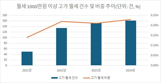 2020년까지만 해도 1000만원 이상의 월세를 납부하는 신규 거래는 아예 없었다. 600만원이 넘는 월세 신규 계약도 고작 4건에 불과했다. 그러나 2021년 50건, 2022년 135건, 2023년 153건으로 점차 증가했다. 전체 월세 신규 계약에서 고가 월세 거래가 차지하는 비중도 2021년 0.14%, 2022년 0.22%, 2023년 0.21%, 2024년 0.23%로 계속해서 증가하는 추세다.