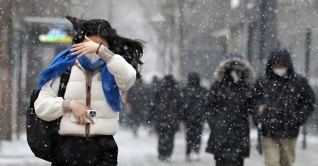 서울 종각역 인근에 눈이 내려 시민들이 눈을 피하고 있다 / 뉴스1