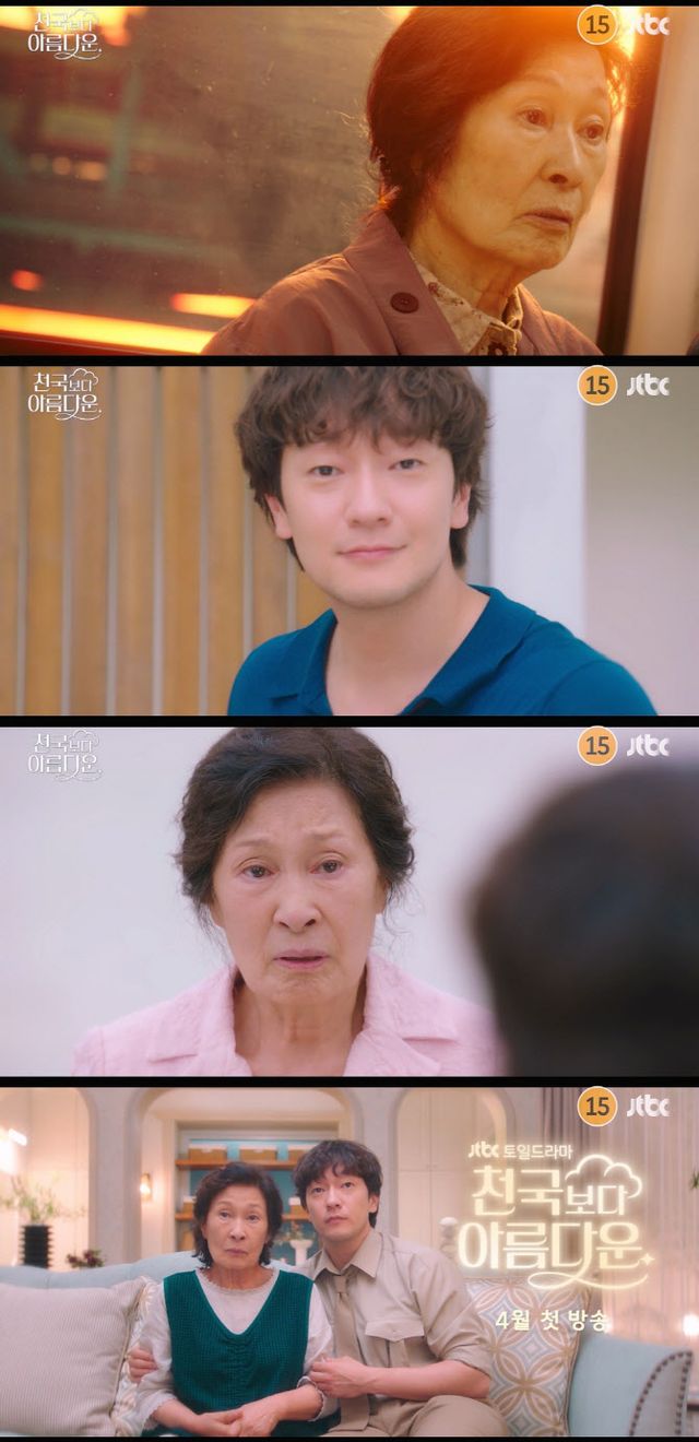 JTBC 새 토일드라마 ‘천국보다 아름다운’(연출 김석윤, 극본 이남규·김수진, 제작 스튜디오 피닉스·SLL)은 80세 모습으로 천국에 도착한 이해숙(김혜자 분)이 청년으로 젊어진 남편 고낙준(손석구 분)과 재회하면서 벌어지는 현생 초월 로맨스다. 죽음이라는 인생의 끝에서 제2의 삶을 시작하는 이해숙의 다이내믹한 천국 입성기가 유쾌한 웃음 너머 따뜻한 감동을 선사한다.