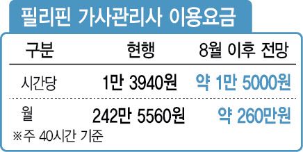 비용 문제도 결정되지 않았다. 대리주부와 돌봄플러스는 이날 “이용가격 등 일부사항이 변경될 수 있으며 상세한 내용은 추후 결정되는 대로 안내하겠다”고 밝혔다. 필리핀 가사관리사는 오는 8월 6일 이후 퇴직금 수급 자격을 얻는다. 입국일(지난해 8월 6일)부터 근로기준법상 근로자로 인정돼 근로기간이 1년이 지나면 퇴직금을 받을 수 있어서다.